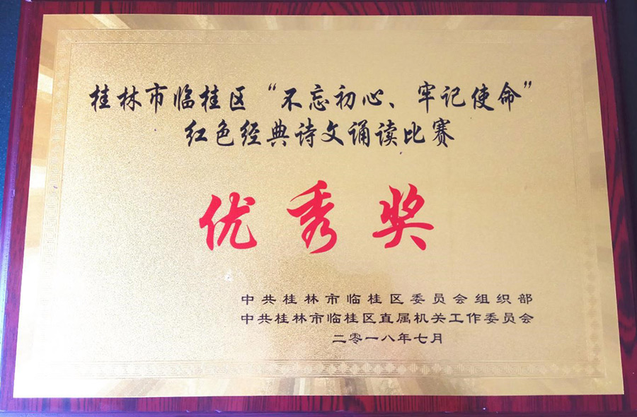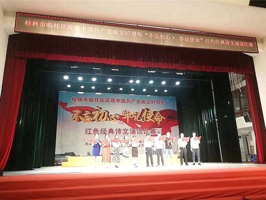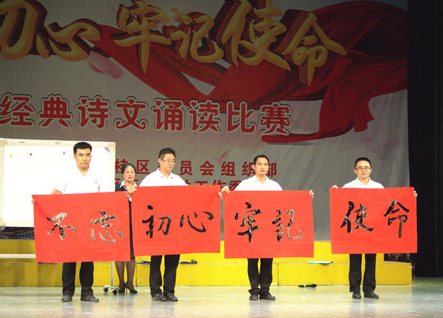 活動中,選手們通過朗誦紅色經(jīng)典詩詞,深情回顧黨的光輝歷程、謳歌黨的豐功偉績,真誠地表達了對黨、對祖國的擁護與熱愛之情。參賽選手們儀態(tài)莊重大方,朗誦聲情并茂,以配樂、舞蹈、書法展示等多種形式,或深情款款、或激情高昂,用飽滿的熱情將紅色經(jīng)典的內(nèi)涵精彩地展現(xiàn)在觀眾面前,充分展示了臨桂區(qū)廣大黨員干部的良好精神風貌。新城投資集團黨支部四名黨員聲情并茂地共誦《不忘初心,牢記使命,我們永遠在路上》,節(jié)目形式新穎,選手感情充沛,朗讀完詩歌后,黨員譚佳璐現(xiàn)場飽含情感的用毛筆書寫了“不忘初心,牢記使命”八個大字,表達了黨員們樹立遠大的理想、力爭上游、為祖國的強盛貢獻力量的決心。與其說這是紅色經(jīng)典詩文誦讀,不如說這是一次視聽盛宴,更是黨員們愛黨愛國的精彩演繹。