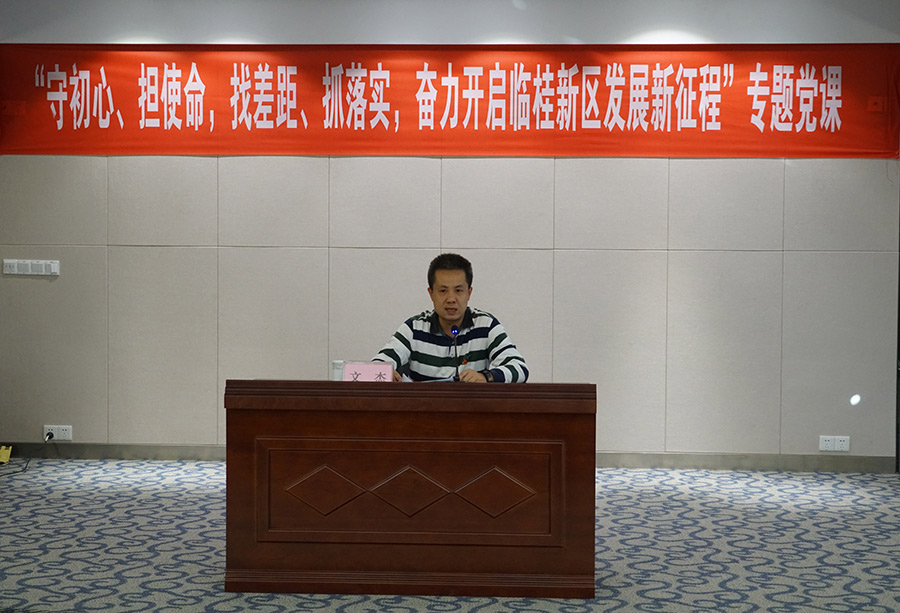 11月4日,按照主題教育安排部署,臨桂新區(qū)工委委員、管委會副主任文杰以“守初心、擔(dān)使命,找差距、抓落實(shí),奮力開啟臨桂新區(qū)發(fā)展新征程”為主題,為新城投資集團(tuán)全體黨員、積極分子、中層副職以上干部上了一堂專題黨課。