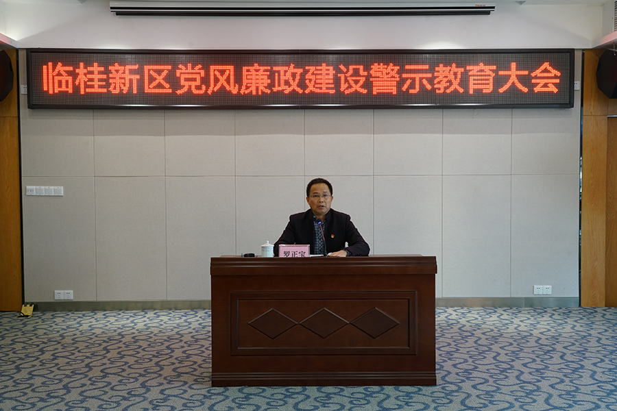 會(huì)上,羅正寶領(lǐng)學(xué)了《國有企業(yè)領(lǐng)導(dǎo)干部廉潔自律有關(guān)規(guī)定》,講解了《中國共產(chǎn)黨問責(zé)條例》。他指出,臨桂新區(qū)黨風(fēng)廉政建設(shè)警示教育大會(huì)的召開,是開展“不忘初心、牢記使命”主題教育的重要一環(huán)。國有企業(yè)廣大黨員干部要按照主題教育“清正廉潔作表率”的目標(biāo)要求,把加強(qiáng)紀(jì)律作風(fēng)建設(shè)工作擺在重要位置,進(jìn)一步加強(qiáng)黨風(fēng)廉政建設(shè),堅(jiān)持依規(guī)用權(quán),帶頭接受監(jiān)督,嚴(yán)格按照民主集中制和“三重一大”議事規(guī)則來議事、來決策、來辦事。要進(jìn)一步強(qiáng)化廉潔意識(shí),嚴(yán)格修身自律,守好人生、家庭和事業(yè)的“底線”, 著力錘煉忠誠干凈擔(dān)當(dāng)?shù)恼纹犯?,不斷開創(chuàng)臨桂新區(qū)全面從嚴(yán)治黨和黨風(fēng)廉政建設(shè)新局面。