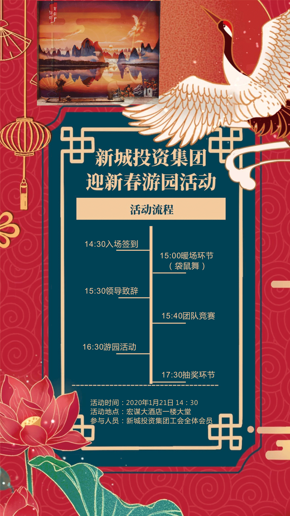 2020年1月21日下午,在集團黨支部的關(guān)心和大力支持下,由新城投資集團工會組織開展的“迎新春游園活動”在桂林宏謀大酒店一樓大堂熱烈舉行。集團黨支部書記、董事長、總經(jīng)理周道林率全體領(lǐng)導(dǎo)班子成員、支部委員參加活動,向廣大員工送上新年的祝福。廣大職工會員積極參與,營造歡樂、和諧的氣氛迎接新春佳節(jié)的到來。