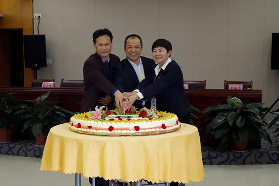 圖為集團公司部分班子領(lǐng)導(dǎo)切九周年生日蛋糕