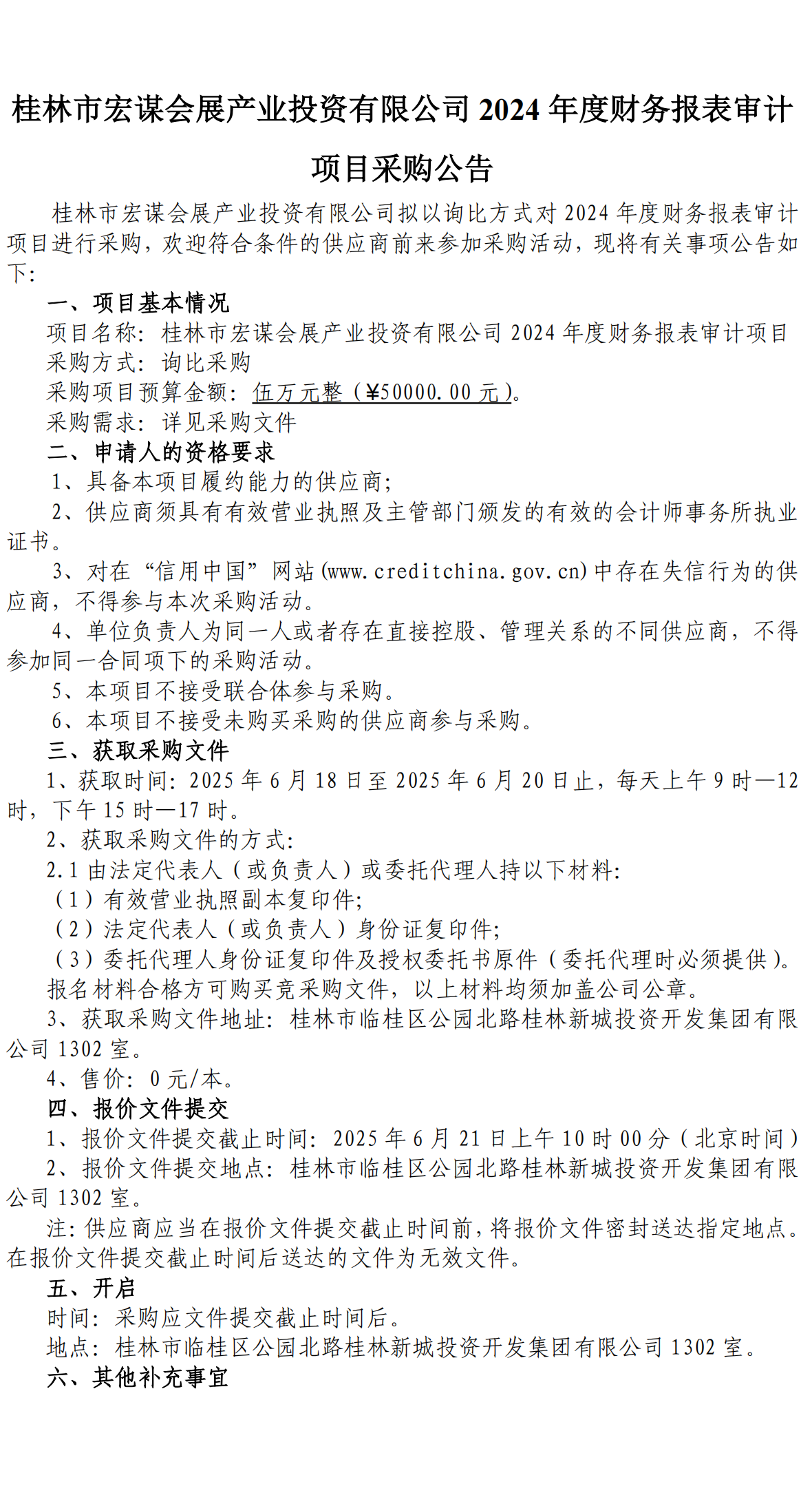 桂林市宏謀會展產(chǎn)業(yè)投資有限公司2024年度財務(wù)報表審計項(xiàng)目采購公告