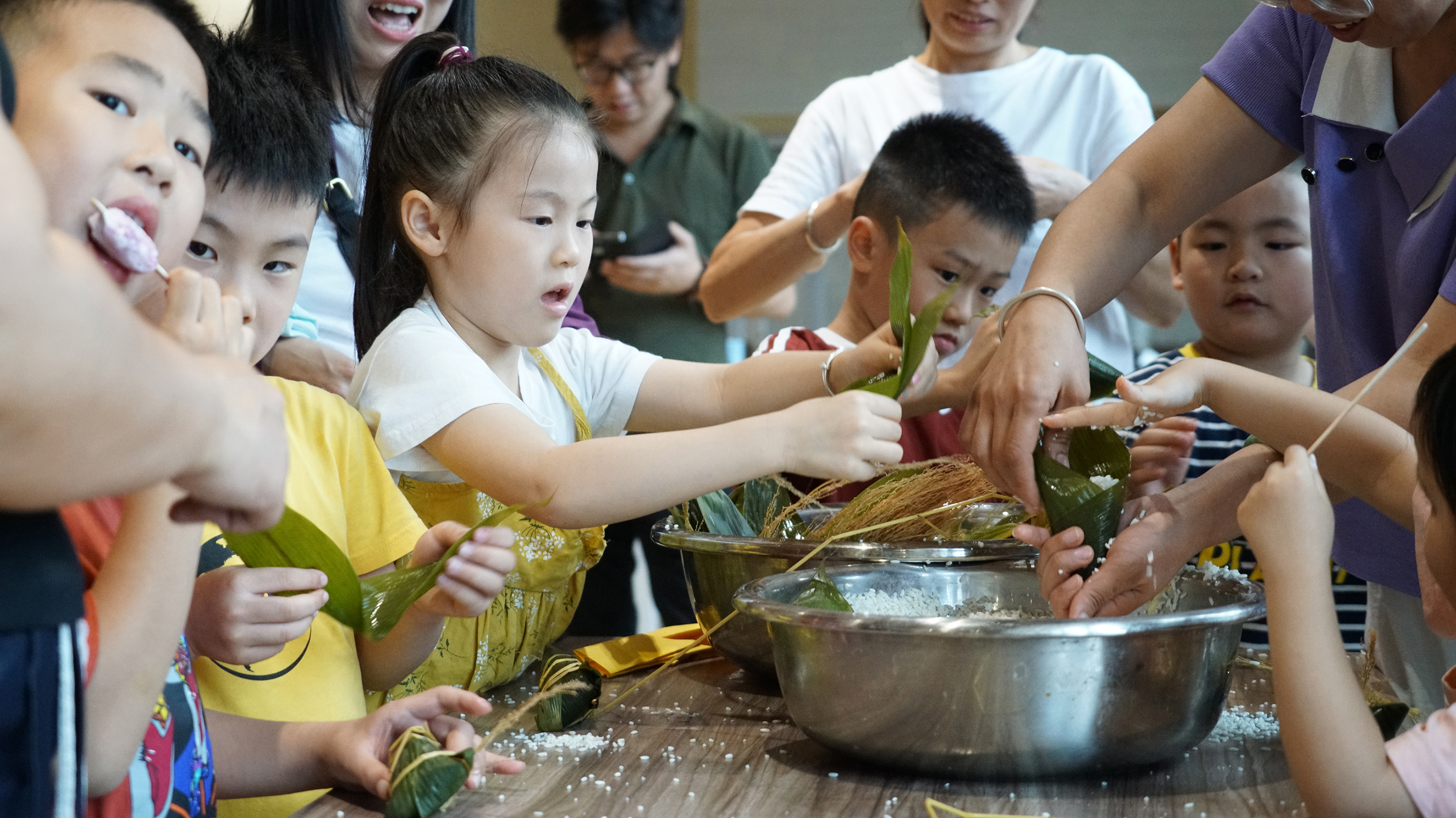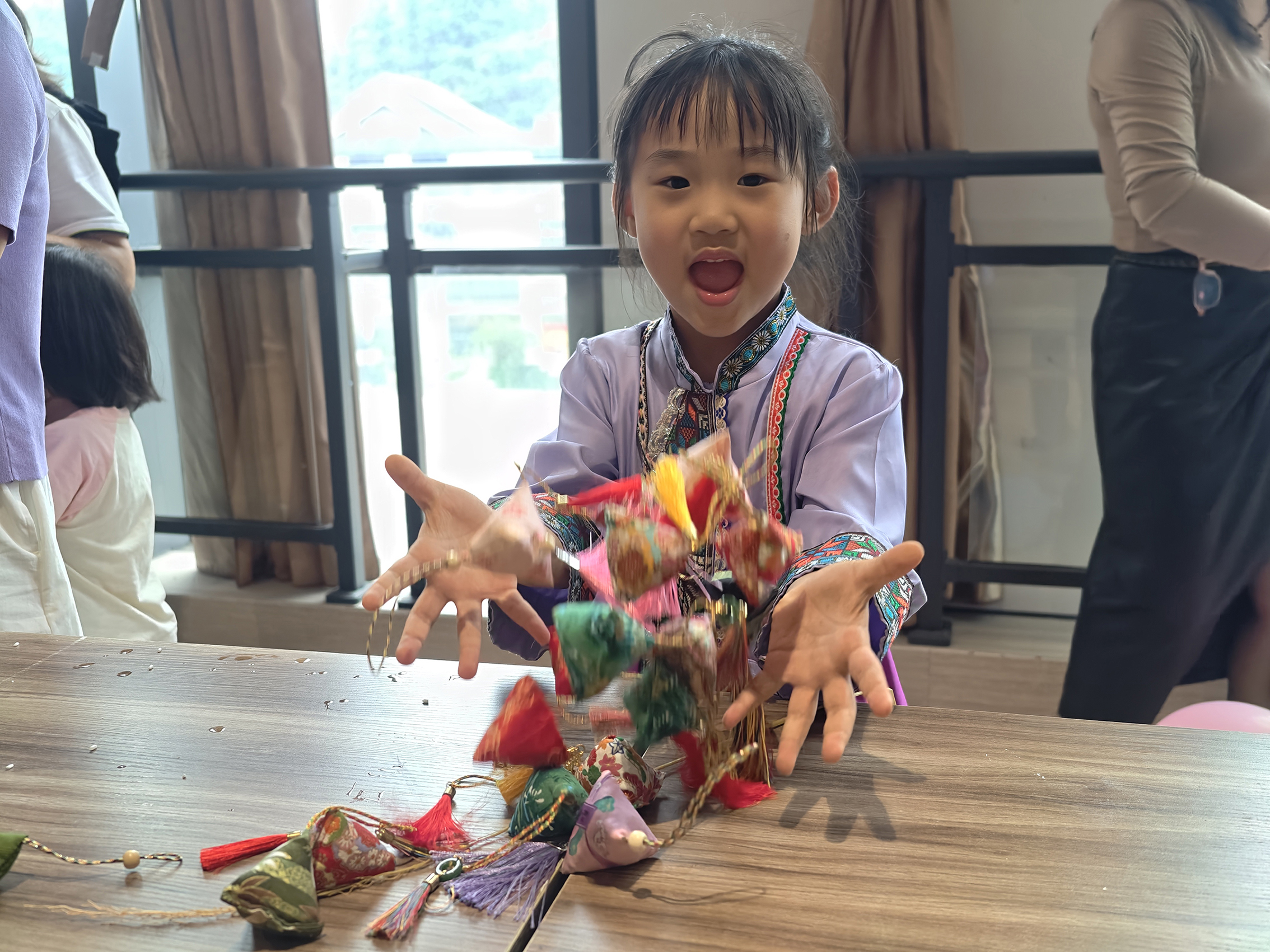 游戲環(huán)節(jié)結束后,大家開始包粽子、做香囊,孩子們圍著長桌,小手笨拙又興奮地學著大人的模樣包粽子、做香囊,翠綠寬大的粽葉在他們手中顯得有些調(diào)皮,不是卷不成錐形,就是裹不緊邊角。另一邊的角落,則是五彩斑斕的香囊世界,孩子們圍坐在一起,桌上鋪滿了色彩鮮艷的綢布、五彩絲線、亮晶晶的小珠子,還有散發(fā)著濃郁草藥香氣的艾草和菖蒲碎。他們用小手仔細地挑選著心儀的布料,小心翼翼地裁剪成小小的口袋形狀。穿針引線對他們來說是個不小的挑戰(zhàn),小眉頭微微蹙起,線頭有時會調(diào)皮地打結,但他們依然樂此不疲。通過包粽子、做香囊使孩子們深入了解中國各民族在端午節(jié)的悠久歷史和豐富的非遺傳承文化,感受到傳統(tǒng)文化的獨特魅力。