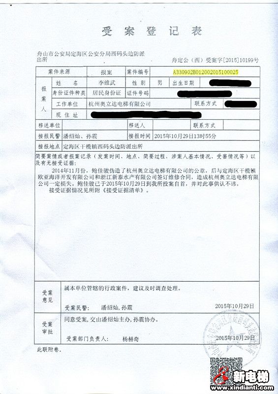 10月29日:公司工程負(fù)責(zé)人李維武在舟山市公安局定海區(qū)公安分局西碼頭邊防派出所(以下簡(jiǎn)稱(chēng)西碼頭邊防派出所)報(bào)案,西碼頭邊防派出所調(diào)查后予以立案,案件編號(hào):A330902B01200201500025。
