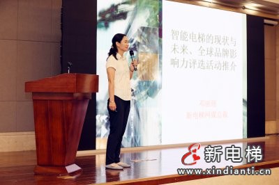 會(huì)議主辦方代表,新電梯網(wǎng)媒總裁、廊坊市睿思文化傳媒有限公司董事長(zhǎng)鄧麗麗女士向與會(huì)者介紹了智能電梯的現(xiàn)狀與未來(lái),并就全球品牌影響力評(píng)選活動(dòng)進(jìn)行推介。