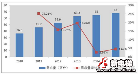核心提示:(一)未來三年電梯行業(yè)需求量預(yù)測 從上面兩節(jié)可知最近幾年電梯需求的概況,2014年中國電梯需求量為65萬臺,同比增長僅為2.69%;自2010到2014年,電梯需求量增長率總體呈下降趨勢。電梯行業(yè)一度被認為已經(jīng)沒有了成長性,但是目前來看電梯行業(yè)還是存在一些可