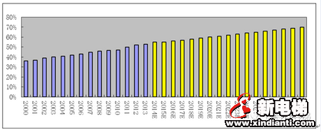 line>圖2.2.4 我國2000~2030年城市化率及預(yù)測3.綠色節(jié)能電梯 我國電梯能耗巨大。據(jù)統(tǒng)計,電梯能耗占建筑總能耗25%左右,我國建筑能耗超過全國能源消耗的20%,并且這一數(shù)字還在不斷攀升。統(tǒng)計數(shù)據(jù)顯示,目前,我國電梯保有量已超過250萬臺,以每臺電梯每天用電40度計算,每年電梯用電量超過365億度。然而,低能效電梯在我國大量普及還是起步階段,使用各類節(jié)能電梯數(shù)量僅占總量約10%,造成了巨大的能源浪費。 社會已經(jīng)漸漸意識到節(jié)能環(huán)保的重要性,企業(yè)也在朝著節(jié)能環(huán)保的方向發(fā)展。國家政策在節(jié)能環(huán)保上給予了很大的支持。奧的斯在新型能源再生科技上有了里程碑式的創(chuàng)新,該技術(shù)可將電梯運行中所耗費的30%~70%的電能收集,并重新輸入電網(wǎng)再利用。較為節(jié)能的永磁同步曳引機已成為曳引機的主流機型,同樣,綠色節(jié)能電梯業(yè)將是電梯的發(fā)展方向,實現(xiàn)電梯的綠色、節(jié)能、環(huán)保。