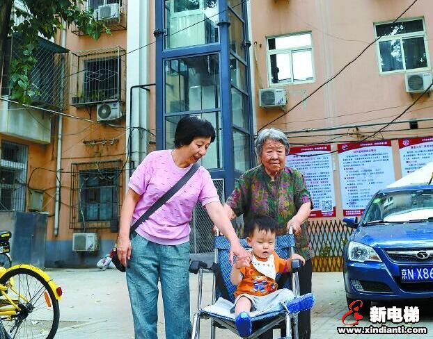 今天上午,趙桂蘭老人在女兒馮秀珊的陪伴下,乘坐新安裝的室外電梯下樓與重孫一起散步。