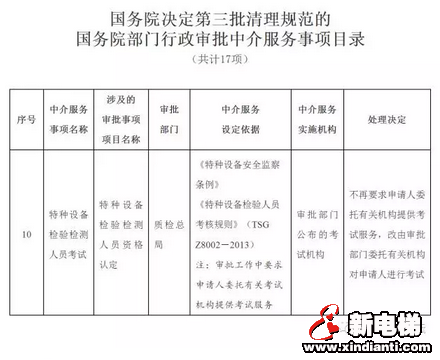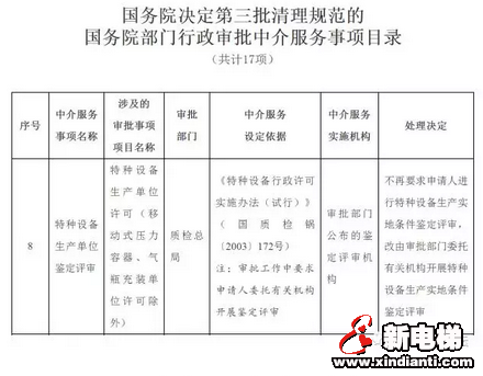 國(guó)務(wù)院決定第三批清理規(guī)范17項(xiàng)國(guó)務(wù)院部門(mén)行政審批中介服務(wù)事項(xiàng),不再作為行政審批的受理?xiàng)l件。其中涉及特種設(shè)備的占三項(xiàng),分別是特種設(shè)備生產(chǎn)單位鑒定評(píng)審、特種設(shè)備檢驗(yàn)檢測(cè)機(jī)構(gòu)鑒定評(píng)審和特種設(shè)備檢驗(yàn)檢測(cè)人員考試。