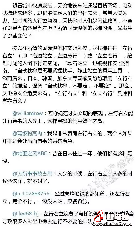 【乘扶梯該"左立右行"還是"左行右立"?】很多早先施行"左行右立"的國家開始施行新規(guī):大家盡量在自動(dòng)扶梯上均勻分散地站立,不走動(dòng).在"左行右立"最普遍的日本,鑒于事故和受傷事件不斷增加,去年也出臺(tái)了乘扶梯新規(guī),要求搭乘電梯時(shí)不能走動(dòng),只能扶住扶手站立,兩名乘客間必須隔一個(gè)臺(tái)階。