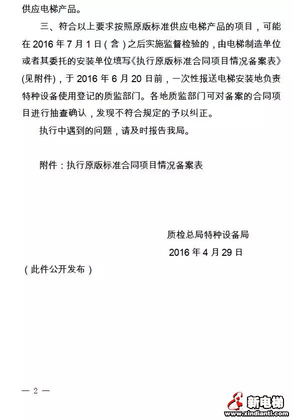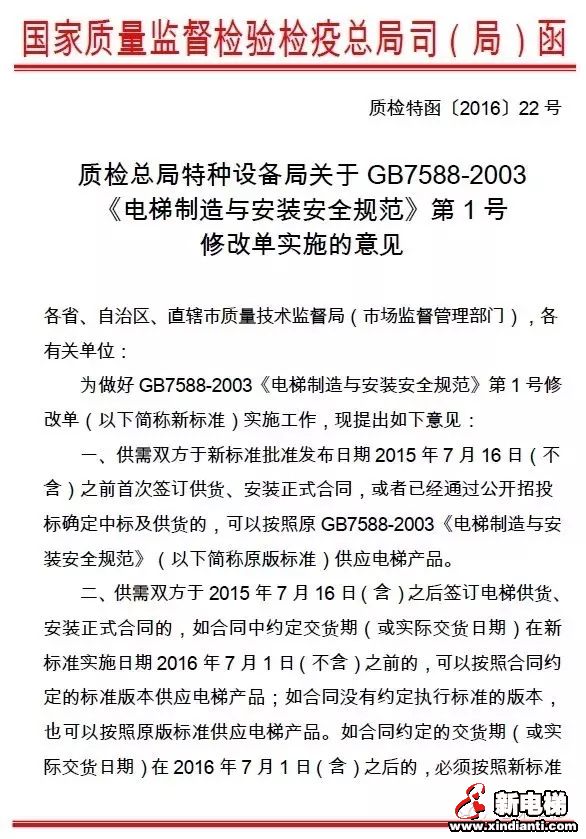 As required elevator products delivered after the date of July 1st,2016, should be supplied under the standard of the Amendment 1 of GB7588-2003, which modifies mainly on the strength of the floor door, the opening of the car door (opening from the inside) and unintended car movement protection, etc..