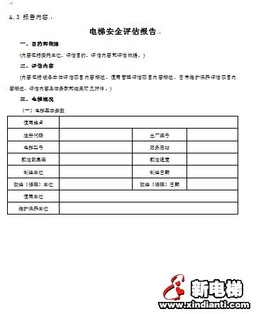 安全評估報告格式及主要內(nèi)容參見附錄A(資料性附錄)。安全評估報告的結(jié)論頁應(yīng)當(dāng)有安全評估、審核、批準(zhǔn)人員的簽字和安全評估機(jī)構(gòu)檢驗(yàn)專用章或者公章。安全評估報告中的電梯設(shè)備概況、綜合分析內(nèi)容與安全評估綜合結(jié)論應(yīng)當(dāng)按照下述規(guī)定的內(nèi)容描述: