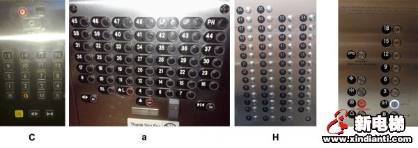 列數(shù)問題大多出現(xiàn)在高樓層的電梯上,讓人頭皮發(fā)麻的程度因樓層數(shù)目和排布列數(shù)、考慮盲文與否、盲文設(shè)計(jì)優(yōu)劣而各異,如圖C、a、H所示。H簡直是個(gè)中翹楚、集大成者,樓層數(shù)多列數(shù)多,考慮盲文又考慮的很糟糕,本來已經(jīng)有4列50多個(gè)樓層按鈕了,盲文標(biāo)示一出,乍一看就是按鈕數(shù)目翻倍的感覺,實(shí)在是頭疼。