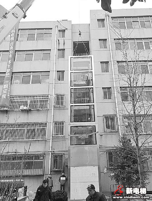 26日上午9點(diǎn)30分,記者來(lái)到省糧食局宿舍8號(hào)樓2單元,只見(jiàn)吊車、鋼結(jié)構(gòu)電梯立方體和安裝工人已經(jīng)就位。在一位領(lǐng)隊(duì)的指揮下,吊裝工人熟練地操作吊車進(jìn)行電梯的安裝。