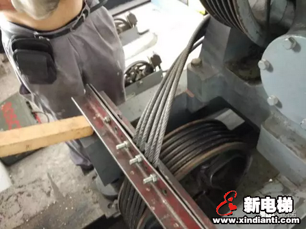 三、頂樓掛手拉葫蘆,掛好后接著用木方頂對重,確定頂好對重后人為動作安全鉗,接著在機房對重側(cè)安裝夾纜板,確定OK后再接葫蘆將機箱吊起,直至鋼絲繩能脫離曳引輪為止。