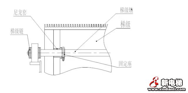 3) 用梯級扳子將曳引鏈軸兩側(cè)的固定座松開,將尼龍?zhí)籽剌S從梯級孔中敲出(如圖4)