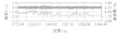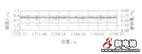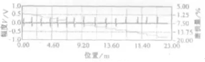 鋼絲繩檢測前應(yīng)制備與受檢鋼絲繩一致的標準試樣來校準檢測儀器,并可得到儀器相應(yīng)的校準曲線(圖2)。圖3是某電梯鋼絲繩斷絲檢測曲線圖,圖4是某鋼絲繩銹蝕曲線圖。通過濾波后,可以比較直觀地與標準試樣的曲線圖形進行對比分析。