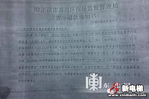 南崗區(qū)市場(chǎng)監(jiān)督管理局向恒信物業(yè)下達(dá)的責(zé)令退款通知書(shū)復(fù)印件。