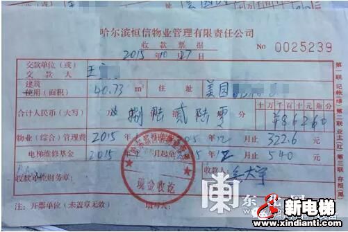 業(yè)主繳納電梯費(fèi)的收據(jù)顯示8樓業(yè)主需繳納540元電梯費(fèi)。