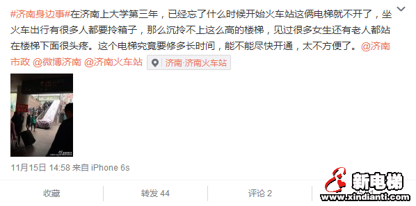 “在濟(jì)南上大學(xué)第三年,已經(jīng)忘了什么時(shí)候電梯開始停運(yùn),坐火車出行攜帶行李箱拎不上這么高的樓梯,見過很多女生還有老人站在樓梯下面很頭疼,很不方便!”11月17日,微博名為“@許可可xk”的網(wǎng)友反映,濟(jì)南火車站出站口電梯又出現(xiàn)停運(yùn),給旅客造成了很大不便?!癅許可可xk”提出質(zhì)疑的同時(shí),對(duì)電梯開通時(shí)間也提出了疑問——“濟(jì)南火車站,網(wǎng)友問你們電梯修好了嗎?大學(xué)都畢業(yè)了!”