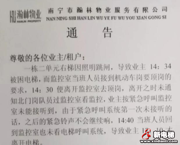 核心提示:根據有關報道,10月15日,廣西某小區(qū)55歲的業(yè)主甘女士被困在電梯里2個多小時,期間她多次摁了電梯里的緊急呼叫按鈕,卻始終沒有人應答。圖片來源于網絡10月16日,小區(qū)物業(yè)也針對這一事件發(fā)布了通告。至于按了緊急按