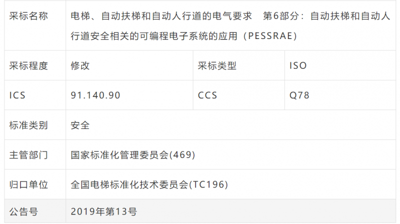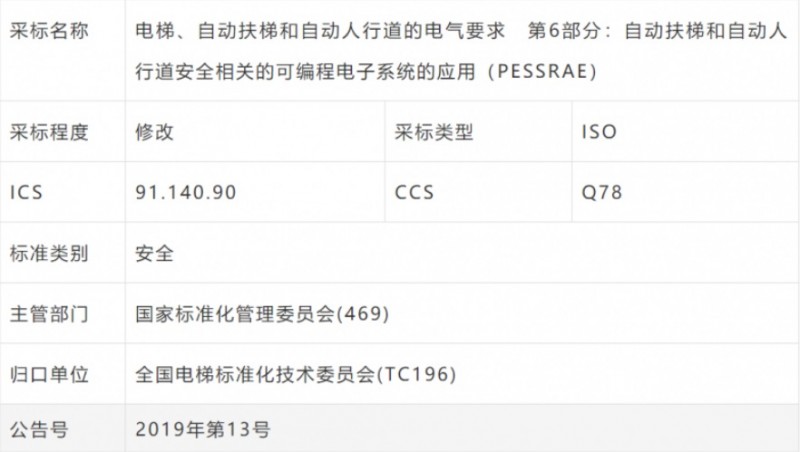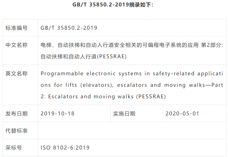 GB/T 35850.2-2019《電梯、自動扶梯和自動人行道安全相關(guān)的可編程電子系統(tǒng)的應(yīng)用 第2部分:自動扶梯和自動人行道(PESSRAE)》為修改采納ISO 8102-6:2019標準,已經(jīng)于2019年10月18日發(fā)布,2020年5月1日起實施。