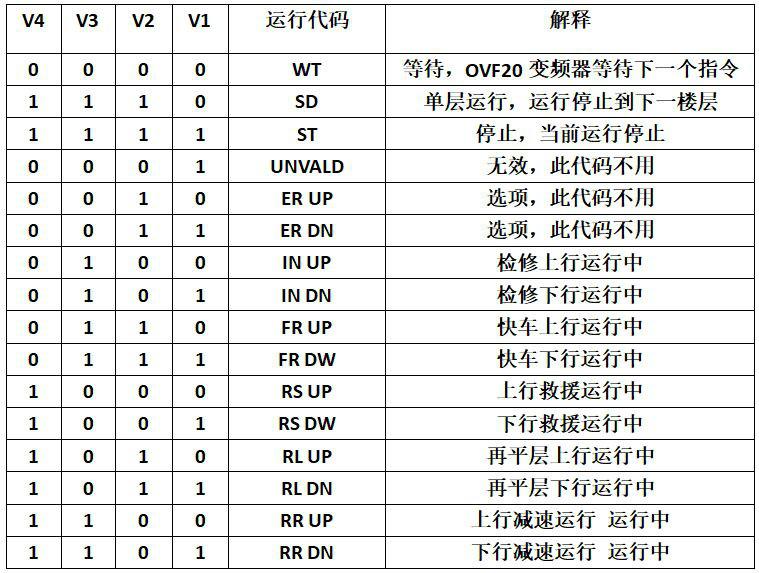 奧的斯電梯邏輯控制板LCB-II(Logic Control Board II )/TCBC(Traction control  board)發(fā)出的運(yùn)行指令是以四位(BIT)的數(shù)字邏輯代碼信號(hào)傳輸給OVF20/OVF20變頻器,控制變頻器的多段速運(yùn)行的運(yùn)動(dòng)狀態(tài)及速度指令,在電梯電氣原理圖中以V1  V2  V3  V4表示,通過(guò)4(BIT)位的V信號(hào)代碼連線組合與變頻器相連,在V1 V2 V3 V4 四根信號(hào)線上的電壓狀態(tài),下表中:“0”表示低電位,電壓為DC 0伏,“1”表示高電位,電壓為DC24伏