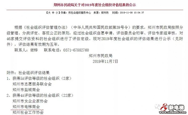 根據(jù)《社會(huì)組織評(píng)估管理辦法》(中華人民共和國民政部第39號(hào)令)的要求,鄭州市民政局對(duì)46家提交評(píng)估資料的社會(huì)組織進(jìn)行了評(píng)估定級(jí)。近日,鄭州市民政局公示2019年度社會(huì)組織評(píng)估結(jié)果,鄭州市電梯商會(huì)獲評(píng)為4A社會(huì)組織稱號(hào)。