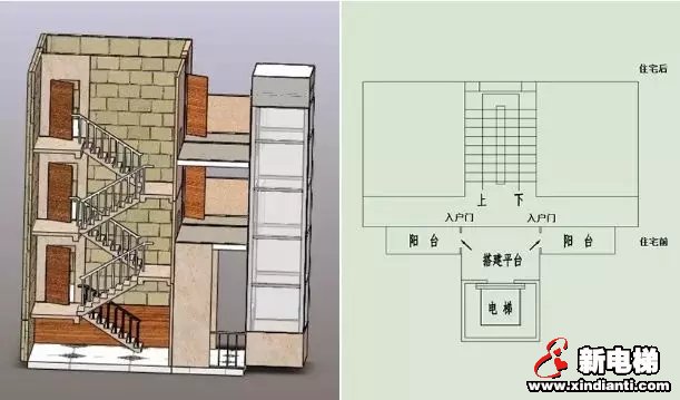 缺點(diǎn):要增設(shè)電梯需對(duì)靠近樓道邊稍作改造才能滿足國(guó)家安全技術(shù)規(guī)范要求,滿足應(yīng)急救援通道要求。該方式適用于樓道兩側(cè)住戶房屋是客廳或是陽(yáng)臺(tái)的房屋結(jié)構(gòu),以及能夠增設(shè)陽(yáng)臺(tái)通道平層入戶的結(jié)構(gòu),采用此種方式入戶時(shí),需要對(duì)房屋進(jìn)行內(nèi)部改造,增加一個(gè)入戶門。