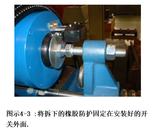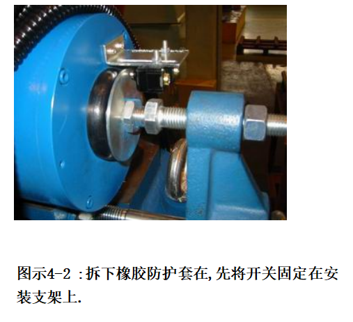 拆下制動(dòng)開關(guān)外面的橡膠保護(hù)套(如果有的話),并將開關(guān)安裝支架上,調(diào)整制動(dòng)開關(guān)固定位置,保證手動(dòng)打開抱閘時(shí)開關(guān)受壓動(dòng)作后仍然有0.5~1.0mm的行程. 調(diào)整順序按圖示4-1, 4-2, 4-3進(jìn)行。