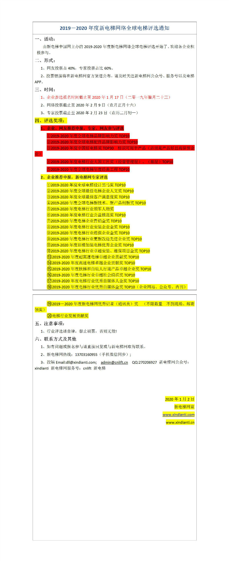核心提示:由新電梯中國(guó)網(wǎng)主辦的2019-2020年度新電梯網(wǎng)絡(luò)全球電梯評(píng)選開(kāi)始了。歡迎各企業(yè)積極參與。網(wǎng)友投票占40%,專(zhuān)家投票占比60%。投票鏈接將在新電梯網(wǎng)官方渠道公布。請(qǐng)及時(shí)關(guān)注新電梯網(wǎng)公眾號(hào)、服務(wù)號(hào)以及電梯APP。