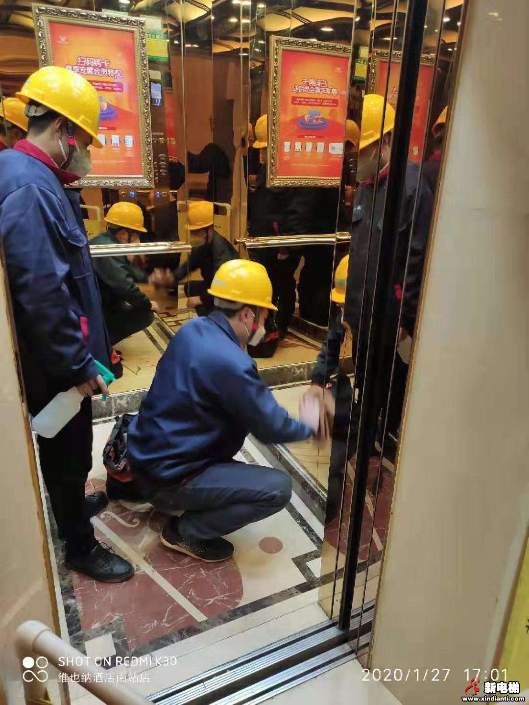 亞洲富士新余長林電梯員工在工作。轎廂、廳門、操縱按鈕、井道、底坑、機房,認真細致消毒。