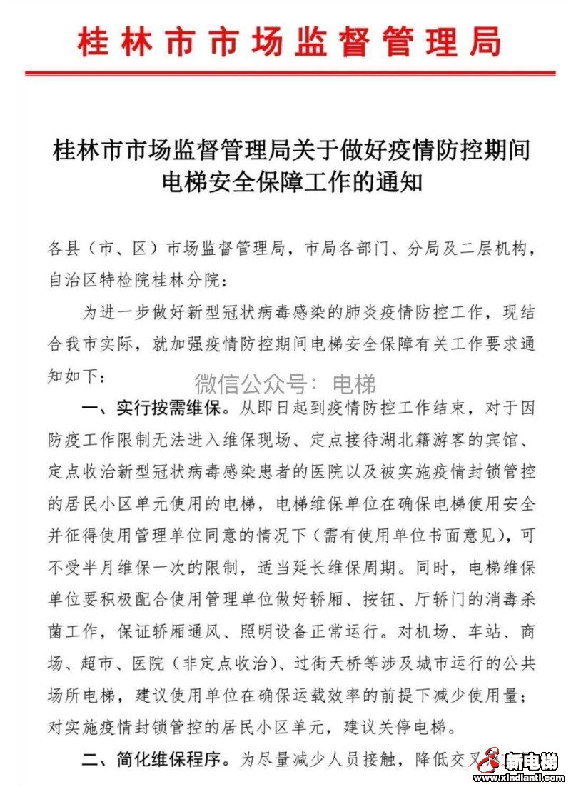 鑒于目前的疫情,為了避免電梯維保人員交叉感染,吉安市、贛州市、桂林市均切合目前的實(shí)際情況出臺(tái)電梯不受15天維保一次限制的文件。