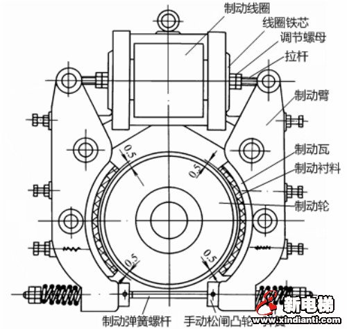曳引機上的電磁制動器,當(dāng)電梯停止運行或斷電時能產(chǎn)生足夠大的制動力矩,使電梯立即停止。