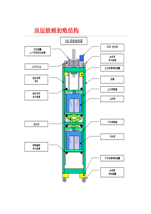 超級雙層轎廂系統(tǒng)的組件結構和概要: 超級雙層轎廂系統(tǒng)是構成超級雙層轎廂電梯的重要部分,可自由地且順暢地改變上下轎廂的間隔,并可應對不同層高的停止層。本系統(tǒng)結構簡單,是用縮放器聯(lián)結上下轎廂,并可進行精密的調(diào)節(jié)。(下面簡稱為SDD系統(tǒng))