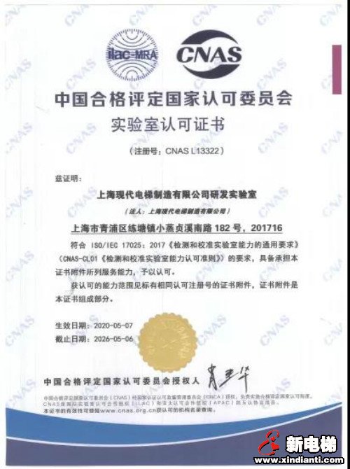 上?,F(xiàn)代電梯測試中心通過CNAS認可