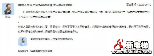 核心提示:【內(nèi)容】好多檢驗機構(gòu)的檢驗人員采用勞務(wù)派遣制度,按人社部勞務(wù)派遣規(guī)定,“用工單位只能在臨時性、輔助性或者替代性的工作崗位上使用被派遣勞動者”。 檢驗人員是檢驗機構(gòu)的主要、重要崗位,顯然不屬于以上三種情況,采用勞務(wù)派遣制度已經(jīng)涉嫌違法,同時既不利于管理,也不利于落實檢驗責(zé)任,請總局及時糾正此種違法行為。