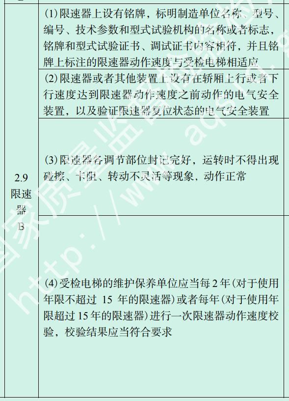 (4)受檢電梯的維護保養(yǎng)單位應當每2年(對于使用年限不超過15年的限速器)或者每年(對于使用年限超過15年的限速器)進行一次限速器動作速度校驗,校驗結(jié)果應當符合要求。