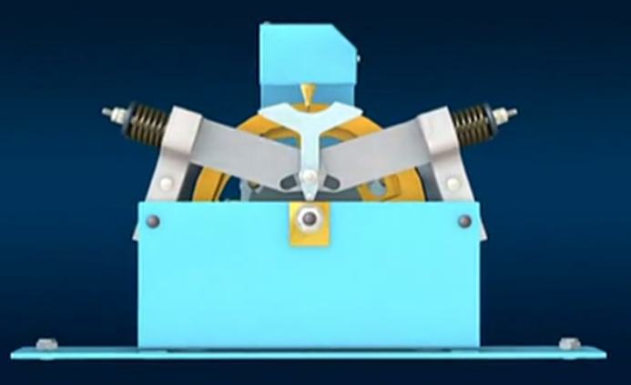 當電梯運行速度超過額定速度一定值時,甩塊由于離心作用向外甩出、直至觸發(fā)電氣開關動作,如下圖所示: