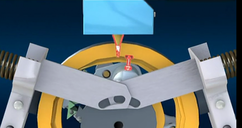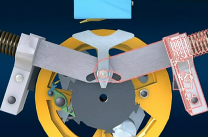 電氣開關動作后,電氣安全回路被切斷,此時制動器失電抱閘,電梯將減速直至停止。若由于電氣開關失效、制動器失效等原因?qū)е码娞菟俣冗M一步增加,甩塊將繼續(xù)向外甩出碰觸棘爪,此時棘輪帶動壓板緊緊壓住限速器鋼絲繩、迫使限速器鋼絲繩處于靜止狀態(tài),如下圖所示: