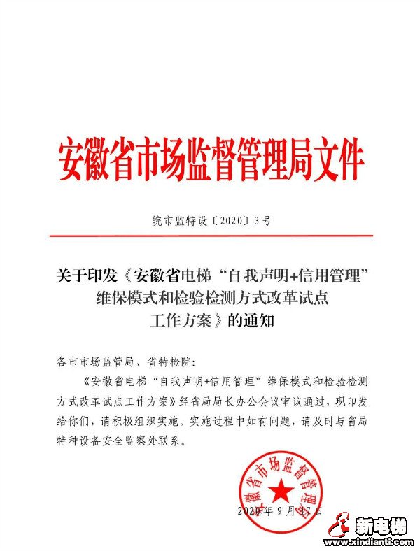核心提示:安徽省發(fā)布電梯“自我聲明+信用管理”維保模式和檢驗檢測方式改革試點工作方案,方案指出,調整試點電梯檢驗檢測周期新安裝電梯監(jiān)督檢驗后6年 以內,每3年檢驗1次,在不實施檢驗的年份每年檢測1次;15年以內的電梯,每2年檢驗1次