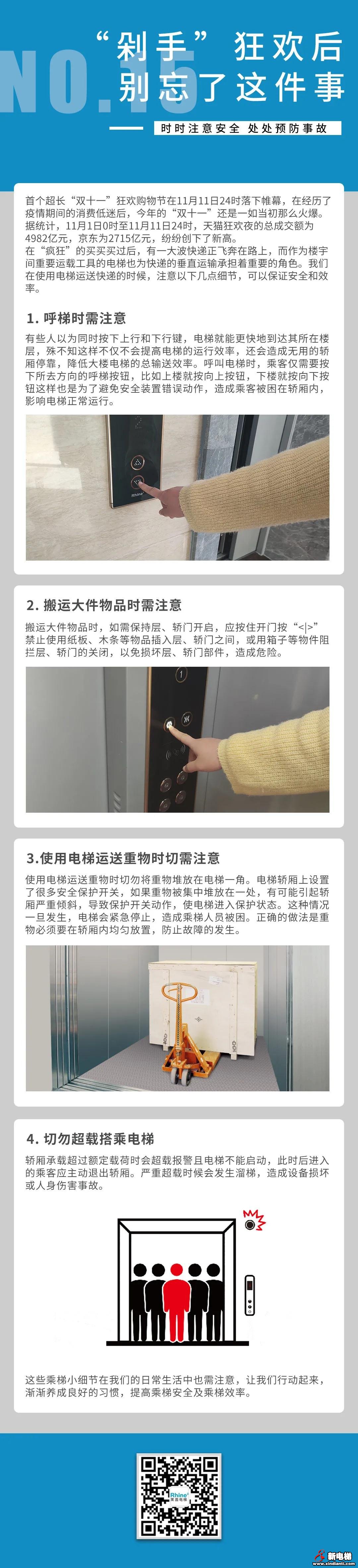 瘋狂的買(mǎi)買(mǎi)買(mǎi)過(guò)后,有一大波快遞正飛奔在路上,而作為樓宇間重要運(yùn)載工具的電梯也快遞的垂直運(yùn)輸承擔(dān)著重要的角色。我們?cè)谑褂秒娞葸\(yùn)送快遞的時(shí)候,注意以下幾點(diǎn)細(xì)節(jié),可以保證安全和效率。