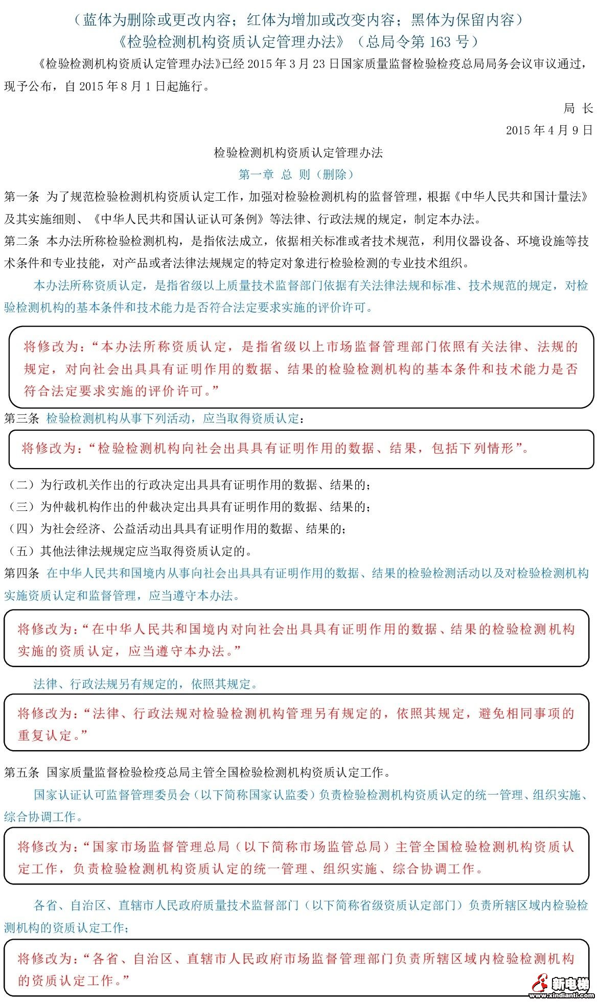 近日,中國政府法制信息網(wǎng)發(fā)布市場監(jiān)管總局關(guān)于廢止和修改部分規(guī)章的決定(征求意見稿),包括對13件部門規(guī)章的廢止和對6件部門規(guī)章部分條款的修改。其中,將對《檢驗檢測機構(gòu)資質(zhì)認定管理辦法》(2015年4月9日國家質(zhì)量監(jiān)督檢驗檢疫總局令第163號公布)作出修改
