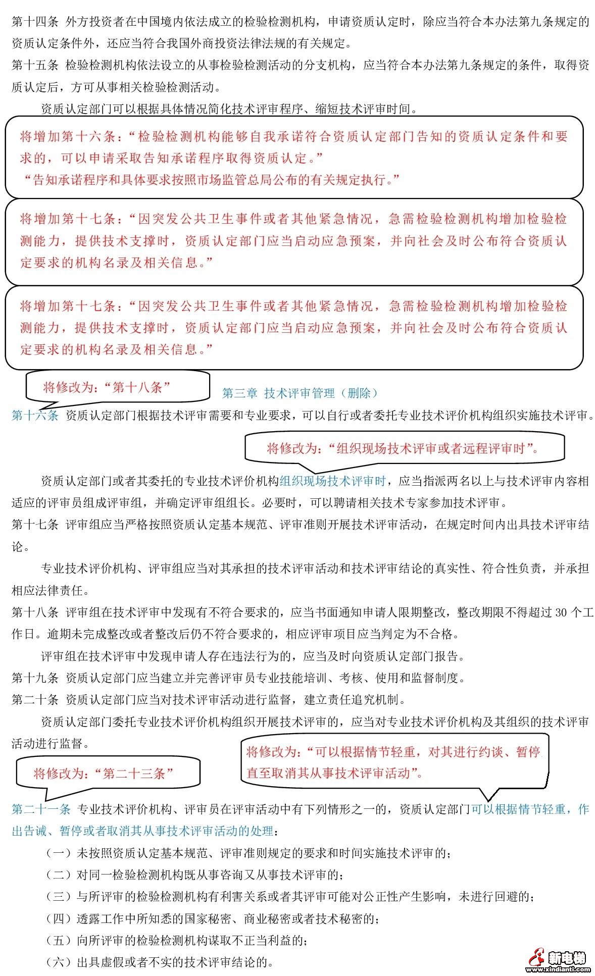 (十三)第二十一條改為第二十三條,將其中的“可以根據(jù)情節(jié)輕重,作出告誡、暫?;蛘呷∠鋸氖录夹g(shù)評審活動的處理”修改為“可以根據(jù)情節(jié)輕重,對其進行約談、暫停直至取消其從事技術(shù)評審活動”。