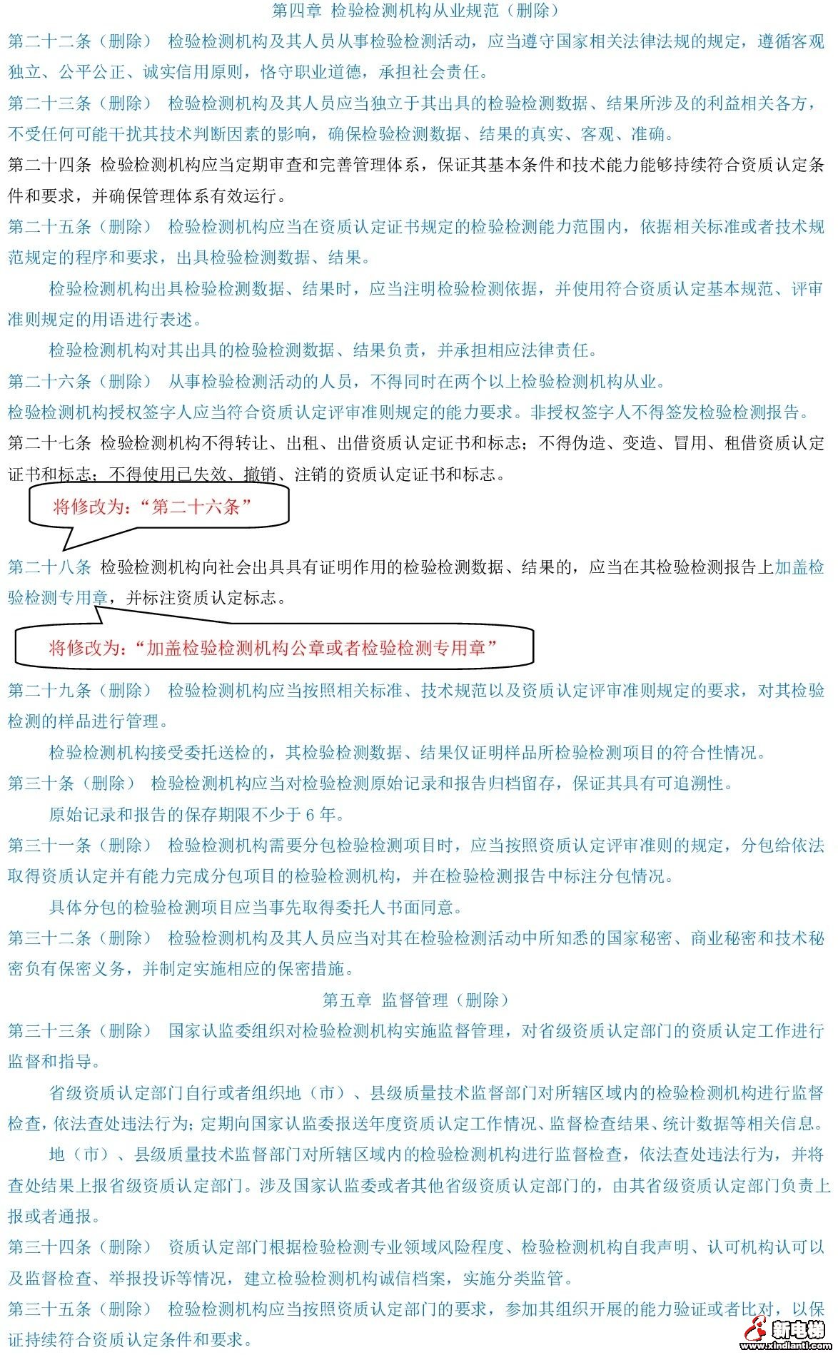 (十五)第二十八條改為第二十六條,將其中的“加蓋檢驗檢測專用章”修改為“加蓋檢驗檢測機構(gòu)公章或者檢驗檢測專用章”。