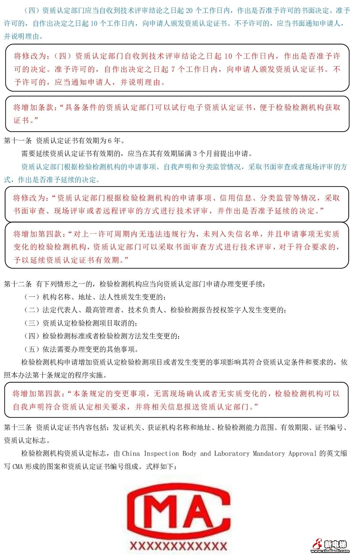 (九)第十二條增加一款,作為第四款:“本條規(guī)定的變更事項,無需現(xiàn)場確認或者無實質(zhì)變化的,檢驗檢測機構(gòu)可以自我聲明符合資質(zhì)認定相關(guān)要求,并將相關(guān)信息報送資質(zhì)認定部門。”