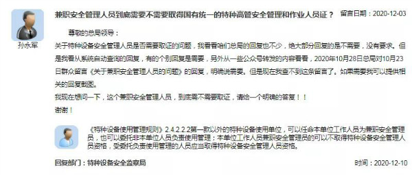 【內(nèi)容】關(guān)于特種設(shè)備安全管理人員是否需要取證的問題,我看看咱們總局的回復(fù)也不少,絕大部分回復(fù)的是不需要,沒有要求。但是我看從系統(tǒng)自動(dòng)查詢的回復(fù),有的個(gè)別回復(fù)是需要,另外從一些公眾號(hào)轉(zhuǎn)發(fā)的內(nèi)容看看,2020年10月28日總局對(duì)10月23日群眾留言《關(guān)于兼職安全管理人員的問題》的回復(fù),明確說需要。但是現(xiàn)在我查不到這條留言了。如果需要我可以提供相關(guān)的回復(fù)截圖。