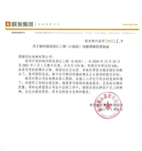 近日,西繼迅達(dá)收到了一封來(lái)自柳州聯(lián)發(fā)濱江壹號(hào)項(xiàng)目的表?yè)P(yáng)函,相關(guān)領(lǐng)導(dǎo)在函中表達(dá)了對(duì)西繼迅達(dá)公司項(xiàng)目負(fù)責(zé)人員的高度贊揚(yáng),并對(duì)項(xiàng)目安裝團(tuán)隊(duì)給予了肯定和感謝,對(duì)西繼迅達(dá)公司維保的高效服務(wù)表示滿(mǎn)意和認(rèn)可。并希望西繼迅達(dá)公司能夠繼續(xù)發(fā)揚(yáng)客戶(hù)至上精神,圓滿(mǎn)完成項(xiàng)目后續(xù)維保工作!