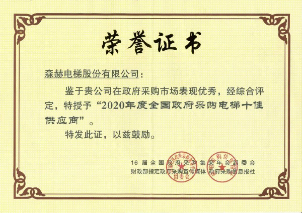 森赫電梯連續(xù)六年榮膺“全國(guó)政府采購(gòu)電梯十佳供應(yīng)商”
