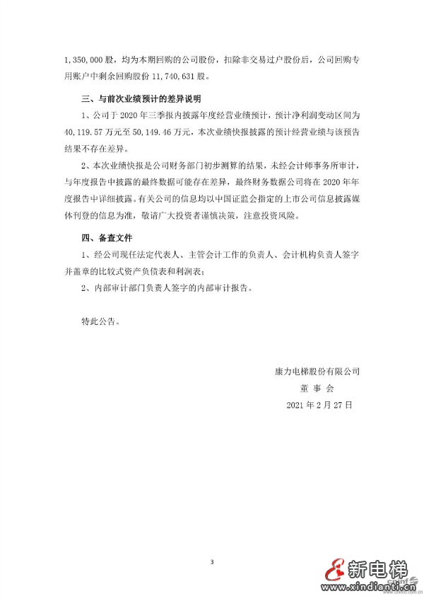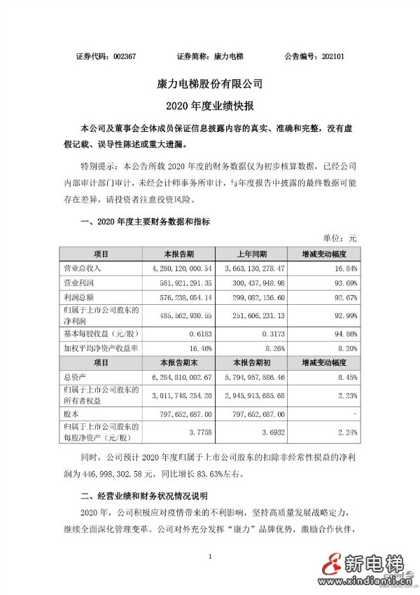 核心提示:康力電梯:2020年營業(yè)收入42.8億元,同比增長16.84%;凈利潤4.86億元,同比增長92.99%。 詳情請以公司公告為準。